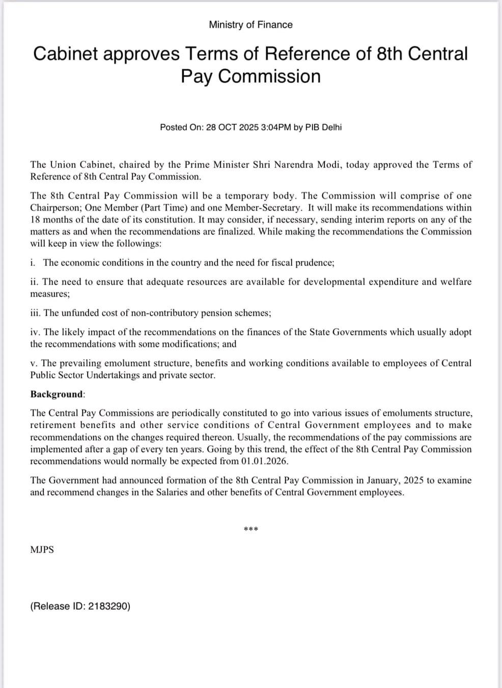कैबिनेट ने 8वें केंद्रीय वेतन आयोग (8th Central Pay Commission) की संदर्भ शर्तों (Terms of Reference) को मंजूरी दी