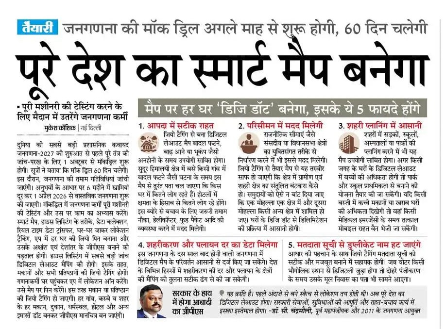 भारत की जनगणना 2026-27: स्मार्ट मैप, सितम्बर, 2025 से शुरु होने जा रही प्रक्रिया।