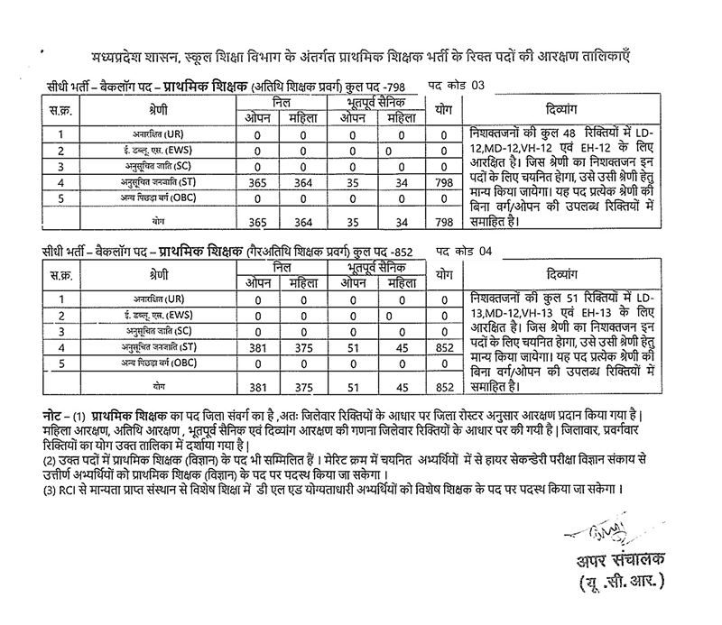 मध्यप्रदेश शिक्षा विभाग में आरक्षण- तालिका
