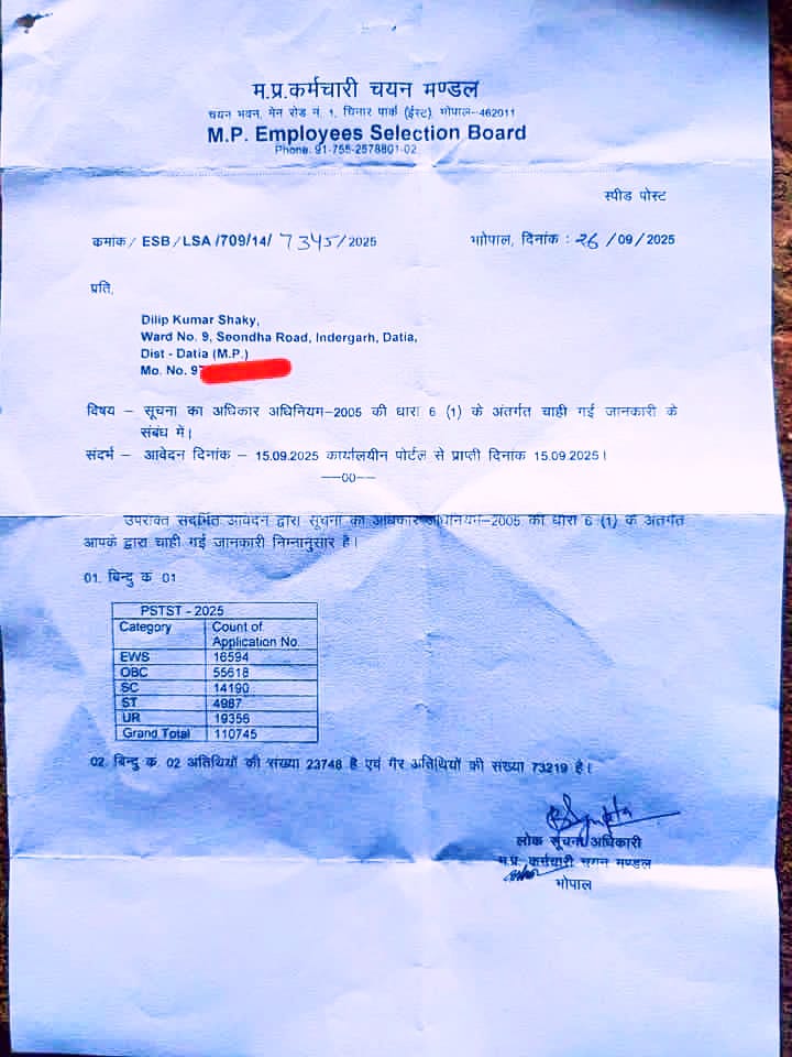 RTI से प्राप्त मप्र प्राथमिक शिक्षक चयन परीक्षा 2025 में शामिल कुल आवेदकों की संख्या