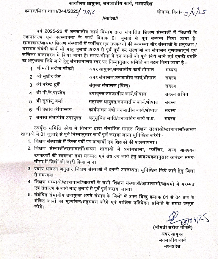 यह आदेश मध्यप्रदेश के जनजातीय समुदाय के छात्रों को सर्वोत्तम शैक्षणिक अवसर प्रदान करने और शिक्षण संस्थानों को आधुनिक सुविधाओं से लैस करने के उद्देश्य से जारी किया गया है। यदि स्थानांतरण और रखरखाव कार्य समय पर पूरे किए जाते हैं, तो इससे न केवल शिक्षकों और छात्रों को लाभ होगा, बल्कि संपूर्ण शैक्षणिक प्रणाली अधिक व्यवस्थित और प्रभावी बन सकेगी।